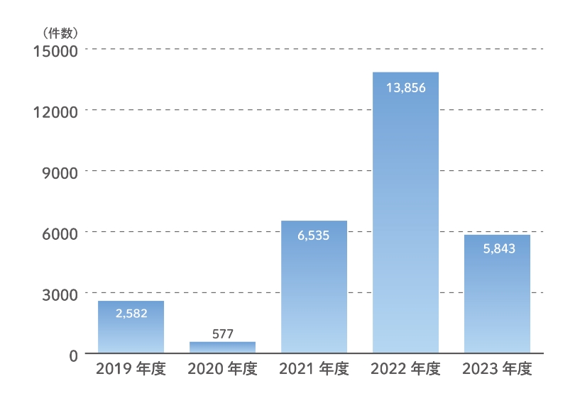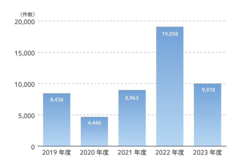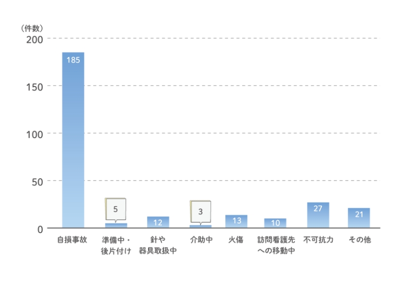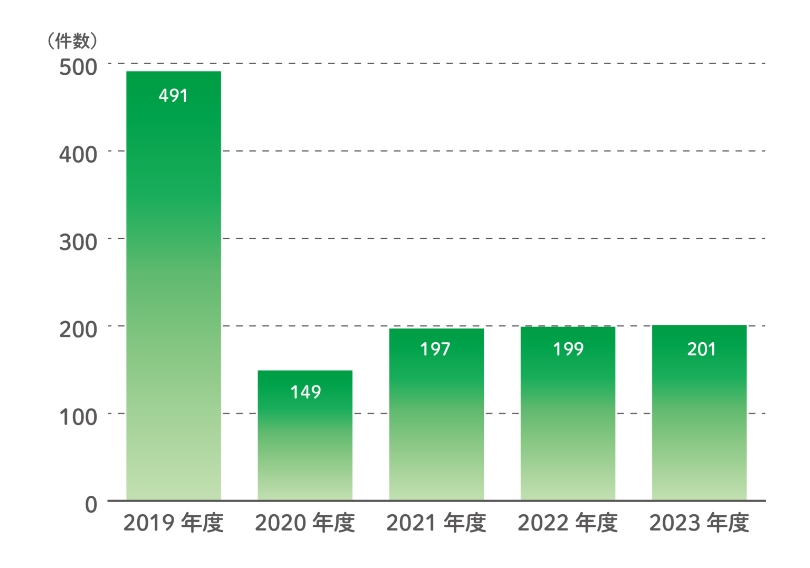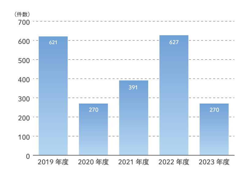 年間の事故報告数は、「新型コロナウィルス感染症」の蔓延に大きく左右されています。2020年度は同感染症拡大防止のための行動自粛等により、事故報告も通年を下回りました。しかし、いわゆるオミクロン株の出現により報告件数は大幅に増加し、2023年度も減少はしているものの高止まり状況にあります。